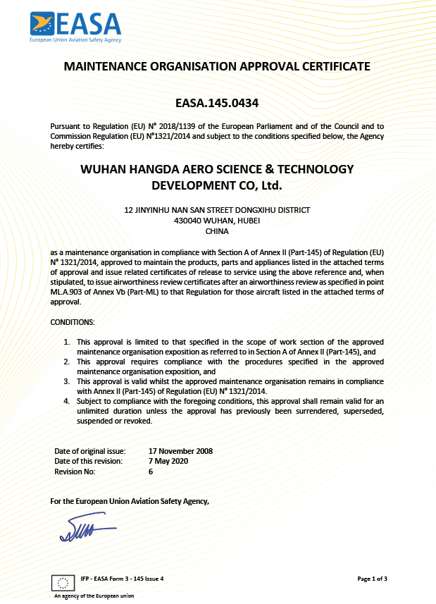 2020年5月  徑河廠區(qū)獲得EASA維修許可。