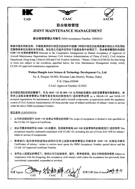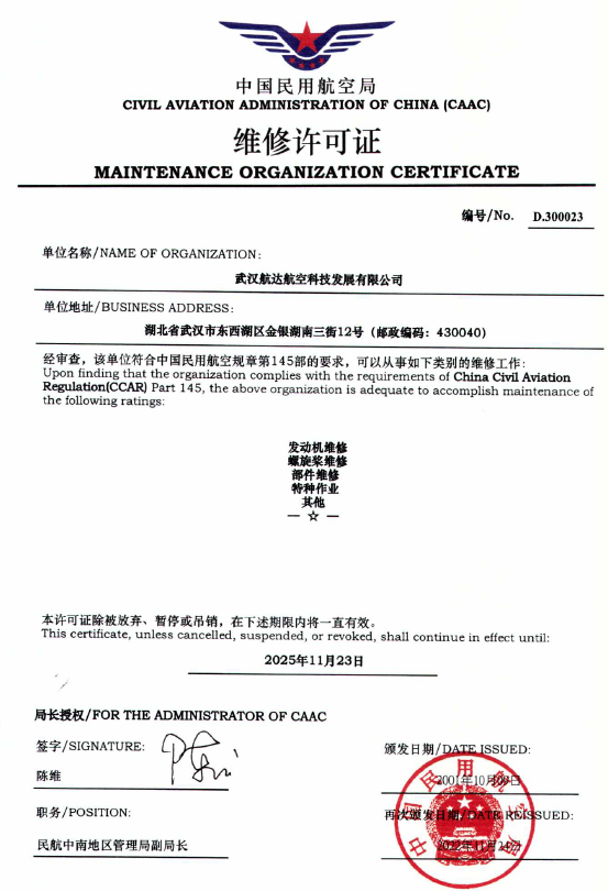 200110月    公司獲中國民航總局授權(quán)的民航維修許可證。